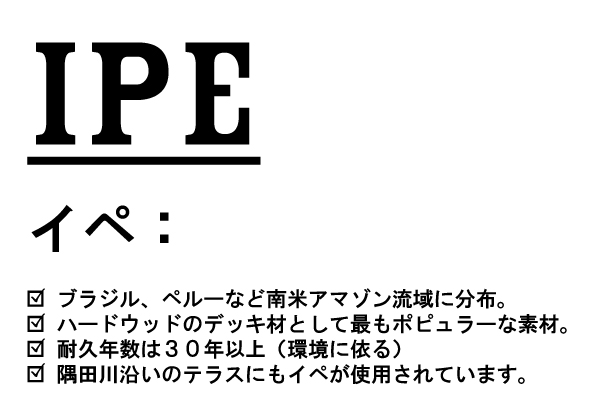 2021/09/24 ”ベランピング” IPE ウッドパネル展示販売中 Marche ベランダでキャンプ気分!高品質ウッドパネル(30cm×30cm)のデモ展示中です。手軽に敷けて、自由にアレンジできます。◎キャンペーン価格1枚: 1,100円(税込) 数量限定。早い者勝ち!2021年 9/23(木)〜26(日) 10:00〜18:00IPE(イペ):・ブラジル、ペルーなど南米アマゾン流域に分布・耐久年数30年以上 ※環境に依る・隅田川沿いのウッドテラスにも使用 « prev next »