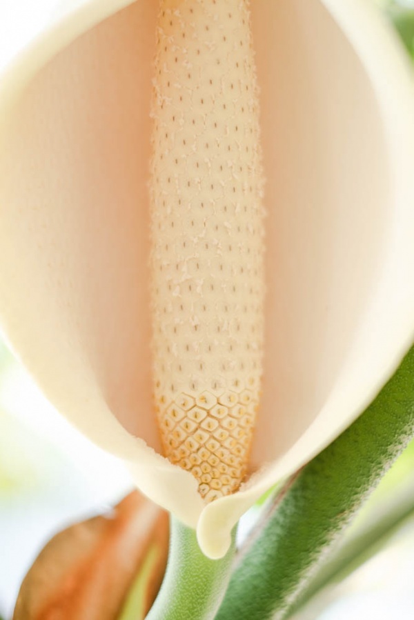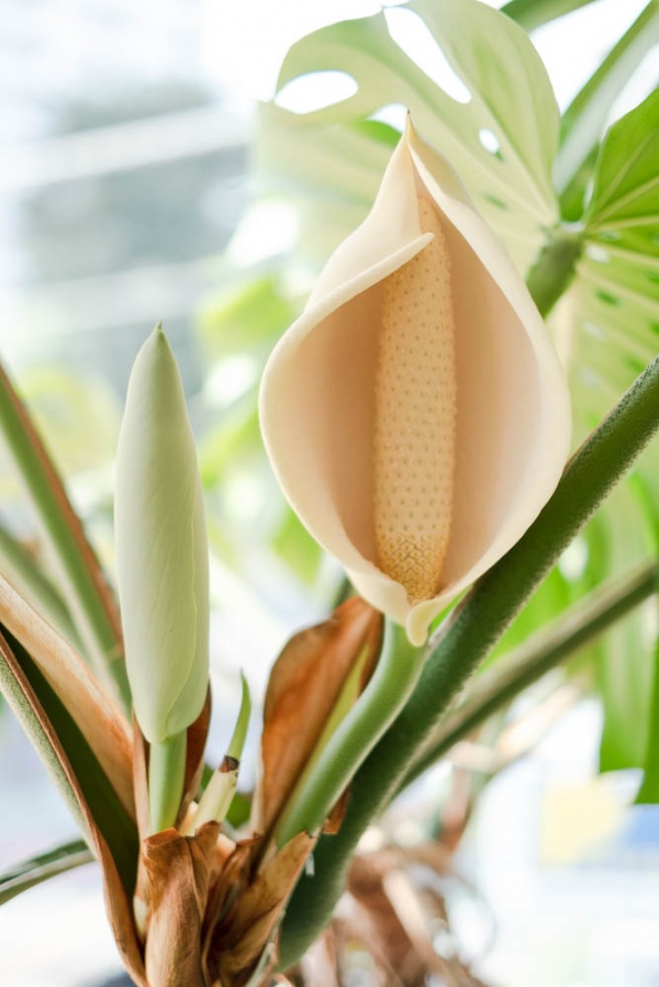 モンステラの花 モンステラの花が咲きました。 「肉穂花序(にくすいかじょ)」と呼ばれる軸と、白い花びらのような「仏炎苞(ぶつえんほう)」はセローム、アンスリウム、クワズイモなどサトイモ科の多くの種にみられるものです。肉穂花序の周囲には小花が密集していて、とても神秘的な眺めです。 モンステラは葉に空いた無数の穴も個性的。薄暗いジャングルで効果的に光を取り込むためのものと言われています。