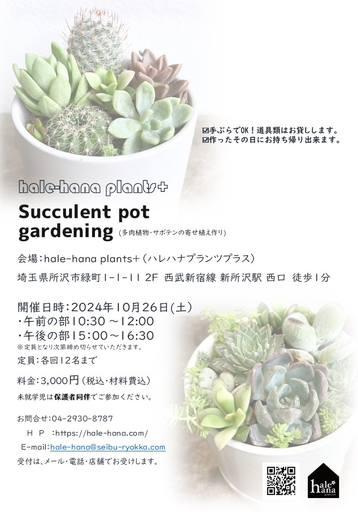 2024/10/18 【Succulent pot gardening】多肉植物・サボテンの寄せ植え作りワークショップのおしらせ Event Information Workshop 多肉植物・サボテンを使った寄せ植え作りのワークショップを企画しました。 植物の寄せ植えが初めての方でもスタッフが丁寧に作り方のコツをお教えしますので どうぞお気軽にご参加ください。 « prev next »